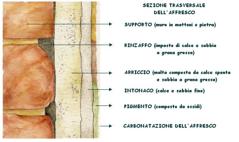 Questa tecnica consiste nel dipingere I’intonaco ancora “fresco” di un muro con colori (pigmenti generalmente di origine minerale) sciolti in acqua: in questo modo, una volta che nell'intonaco si sia completato il processo di carbonatazione, il colore ne sarà chimicamente incorporato acquistando così particolare resistenza all'acqua e al tempo.